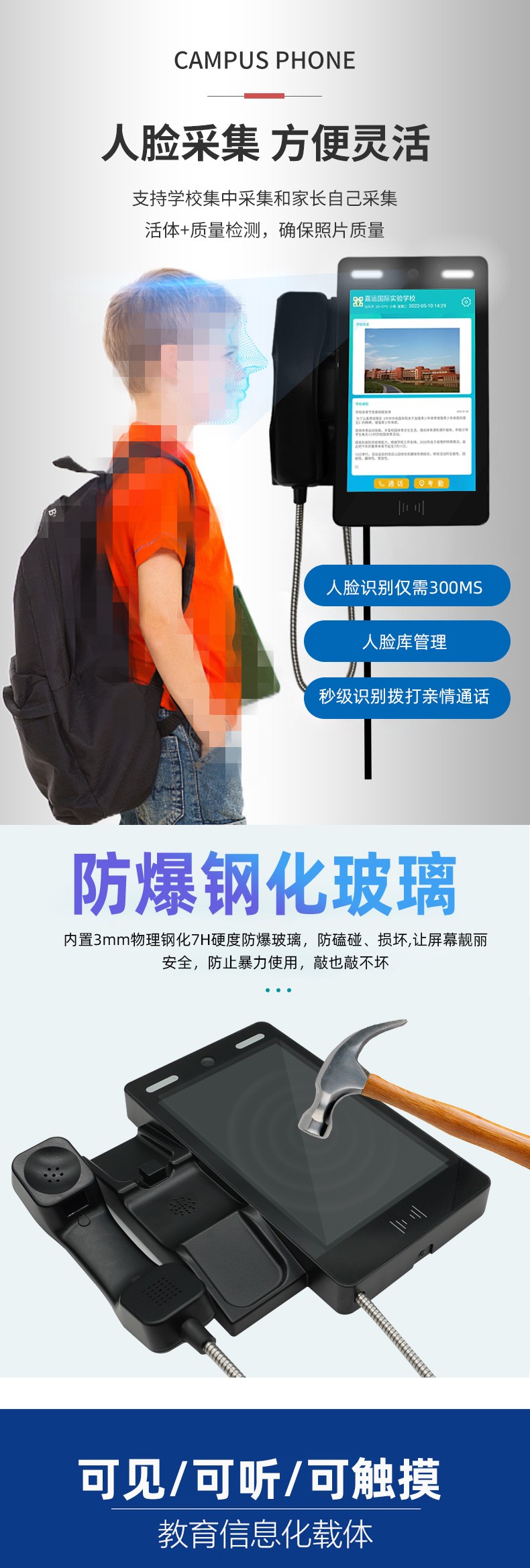 人脸识别可视话机产品稳定,使用方便。可以通过人脸识别,拨打亲子电话,学生可以选择语音或视频。