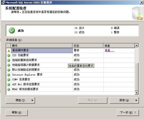 3. 点击【下一步】,系统开始对系统配置进行检测,(正常情况有1个警告或者没有警告,根据电脑配置而定,这个不影响)。