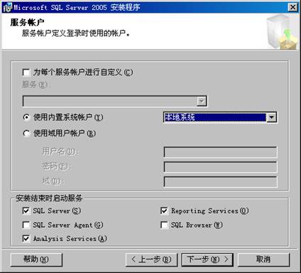 8. 该界面是进行服务帐户设置,选择内置系统账户:本地系统。点击【下一步】