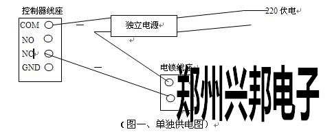 2、 锁到控制器的连接线需采用2芯电源线,控制器到锁距离不可以超过100米,线径大于1.0 mm。如有需门磁检测线则需多2芯线。(可根据现场需要定)。如果输出12V电源有明显降压则可以微调电源电压到13.6V或单独给电锁供电(如图一)。