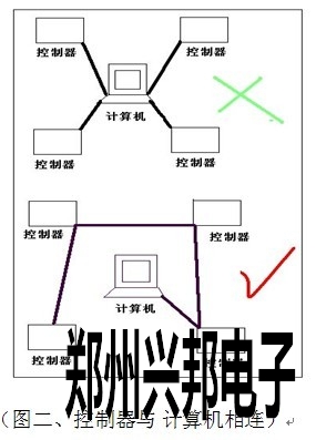 控制器GND 485- 485+分别对应连接485转换器GND TD(A) TD(B),通讯线路采用串联挂接式连接,请勿采用星型连接或者局部星型连接(如图二)。如果线路过长和设备过多,请在最后一台设备上增加终端电阻(有跳线加载)总线最多可挂接128台控制器。