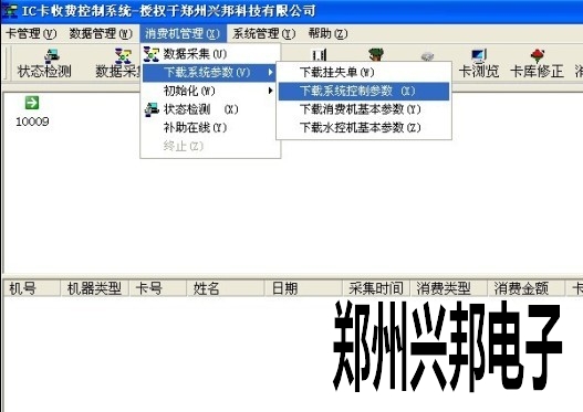 具体操作步骤为:将消费机连接到通讯线上,打开一卡通系统确认机器通讯正常然后选择--消费机管理--下载系统参数--下载系统控制参数--下载消费机基本参数或者下载水控机基本参数(如下图所示)