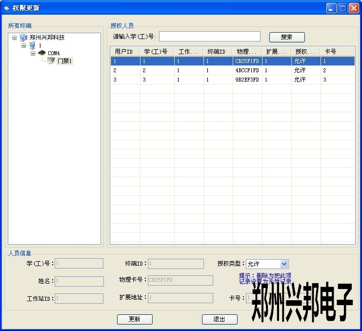 1.选择终端,在右列表框中可显示出该终端下的所有授权人员的名单。或者在请输入学(工)号右边的文本框中录入所要更改权限的学工号,单击搜索按钮可在列表中查询出该人员的授权信息。