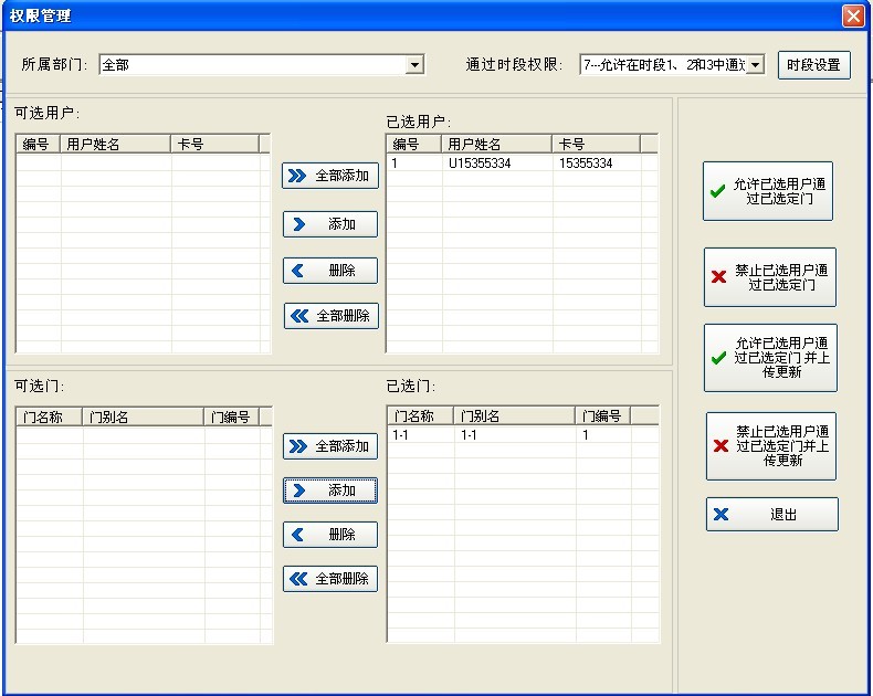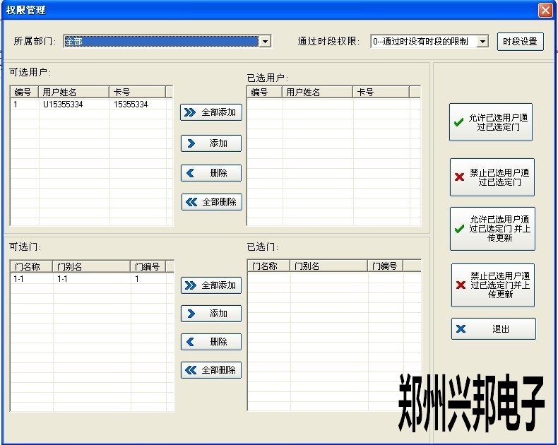 4、上传完成后关闭窗口,在‘通过时间段权限’中选择需要的时间段然后将用户和控制器都添加进去,最后点击‘允许已选用户通过已选定门并上传更新’上传权限。如下图所示
