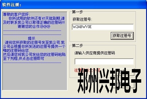 软件安装完成后有一个月的试用期,当过了试用期后软件就打不开了,所以在试用期结束前就要注册软件,软件注册时首先在软件的帮助-软件注册中获取一个注册号,如下图所示,把获取到的注册号发到公司,公司会提供一个注册码,把注册码复杂粘贴到第二步的注册码中,点击注册就可以了。如果软件已经过期获取不到注册号,那么就要通过一个小插件获取注册号,在插件上进行注册就可以了。