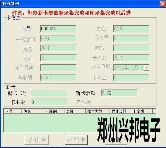 首先卡挂失(比如:卡号为000001),挂失后点卡管理-->补办新卡,然后在卡号处输入1,按回车键,此时会显示出卡信息,如下图所示