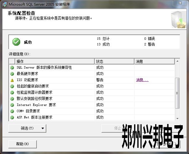 Win7系统2005数据库安装时提示IIS功能要求是警告,如下图所示