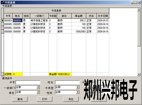 卡信息表主要用于查看卡的基本信息。可以选择相应的条件,然后单击【查询】在表格中会出现相应条件的卡的基本信息,表的最下面显示出所查询出的总记录数及库金额汇总。