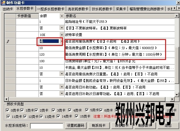 2)打开软件 制卡中心-功能卡制作-水控参数卡中的最低消费周期,先选择启用,然后输入最低消费金额和最低消费周期,最低消费金额以分为单位,最低消费周期以分钟为单位,设置好后点击制参数卡即可;