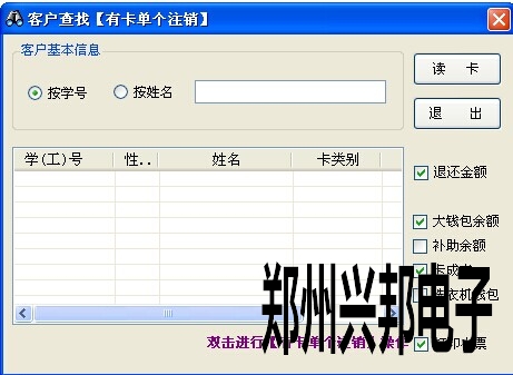 打开软件 制卡中心-卡管理 在空白处鼠标右击,选择有卡单个注销或者无卡单个注销,输入学号或者姓名查询出人员信息后,鼠标双击查询出的人员信息,即可完成注销。