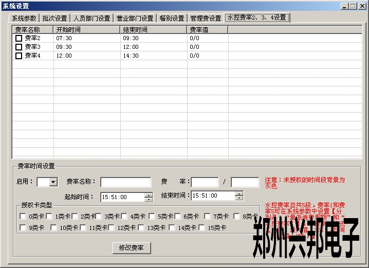 2、设置几点到几点之音流多长时间扣多少钱,在管理中心-系统设置-水控费率2、3、4设置里面设置时间,费率。