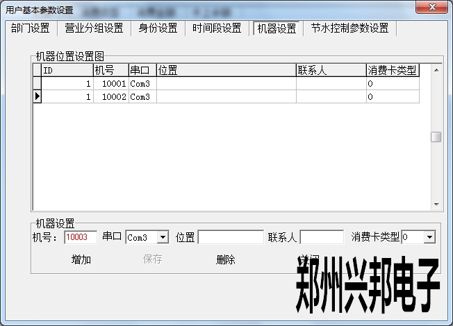 在机器设置中可以添加机器,设置机器号、串口以及消费卡类型,位置、联系人可以选填。其中设置机器号必须输入5位,开头为1,最大可设置为19999.串口是指通讯器连接电脑的端口号,此处的串口号选择不正确的话会导致机器不通讯。