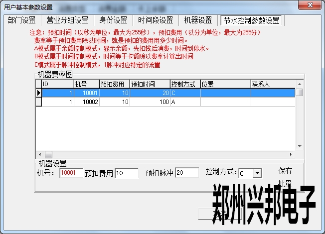 在使用兴邦一卡通平台用户基本参数设置中有部门设置、营业分组设置、身份设置、时间段设置、机器设置、节水控制参数设置。下面依次为其说明。