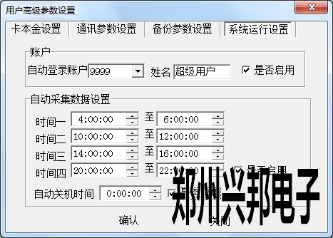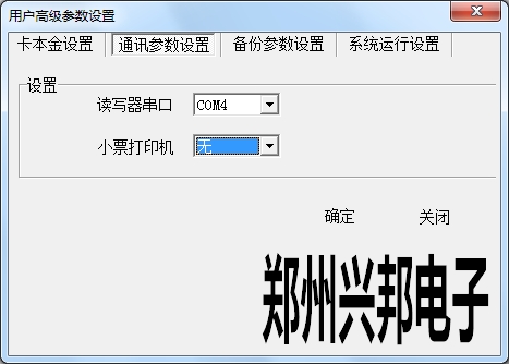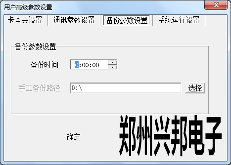 在使用兴邦一卡通平台进行用户高级参数设置时包含卡本金设置、通讯参数设置、备份参数设置和系统运行设置四个参数设置。