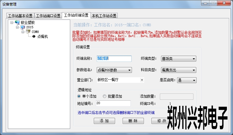 工作站终端设置:在端口地址下添加终端,进行添加时填写终端名称,选择终端类型、参数组名、科目类型、营业部门,是否启用选择是,添加地址时可以选择单个添加和批量添加。此地址编号要与机器的编号相同。进行批量添加时填写添加数量、地址号,点击添加后就可以以地址号递增的形式添加机器。选中终端可以进行修改和删除操作,选择端口右击可以删除端口下的所有终端。