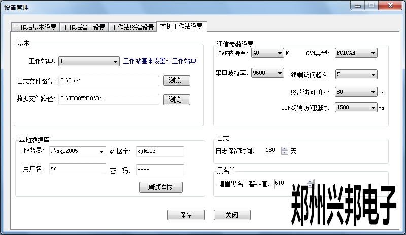 本机工作站设置:工作站ID即选择工作站基本设置中添加工作站的ID号,下面选择存放日志文件和数据文件的地址;通讯参数设置中CAN波特率默认为40K,串口波特率默认为9600,此处设置不对会导致机器不通讯。终端访问超次从1到100,默认为5,终端访问延时从10ms到6000ms,默认为20ms,此处设置会影响监控平台下载参数和上传记录的速度,一般使用默认值;本地数据库设置中服务器选择数据库2005的服务器名,数据库填写创建采集库的数据库名称,用户名sa,密码为hnzz,设置后点击测试连接,看能否连通;日志保留时间和增量黑名单警界值可以自主更改。