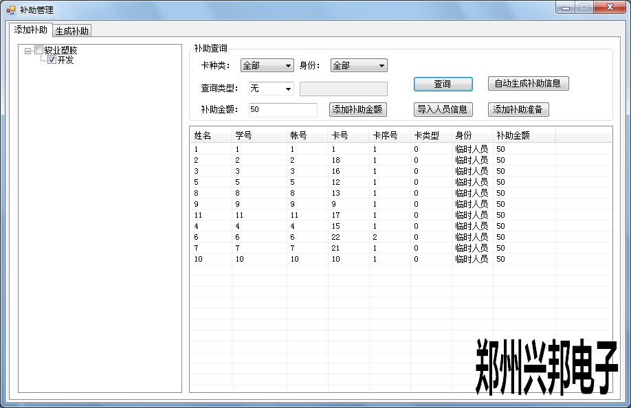 一卡通综合管理系统发放补助的功能是可以生成企业补助钱包,定期发放补助、补助清零。在补助管理中进行添加补助和生成补助。首先进行添加补助,勾选左侧栏部门,可以选择限定条件卡类型和身份以及查询类型(学号、姓名、卡号)进行查询需要添加补助的人员信息,填写补助金额,对所选人员添加补助金额,然后添加补助准备,即可以在生成补助中看到。其中自动生成补助信息是对查询到的人员进行默认为0的补助金额,然后可以添加补助准备。