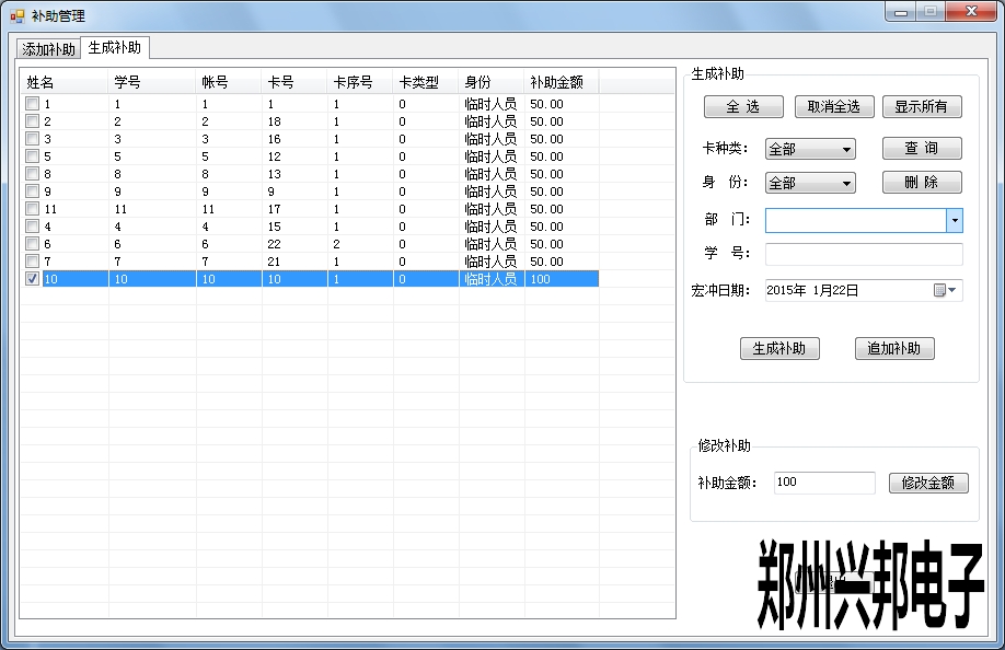 对于添加完成的补助,进行生成补助。对添加补助的信息可以按照卡种类,身份,部门,学号进行查询选择限定条件的人员进行补助,选中补助信息可以修改补助金额。选择删除后此补助计划就没有了。