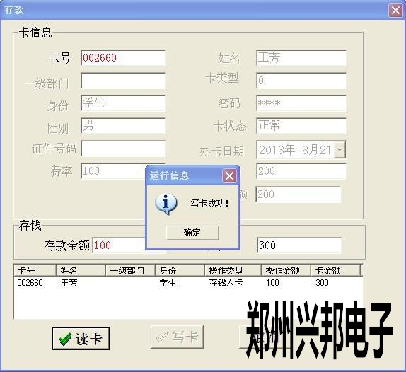 正常的情况是将卡放在读卡器上,点击【读卡】出现卡信息,在存款金额右边的文本框中输入存款金额,然后点击【写卡】,提示写卡成功后点击【确定】按钮即可。存钱后最大卡金额不能超过9999.99