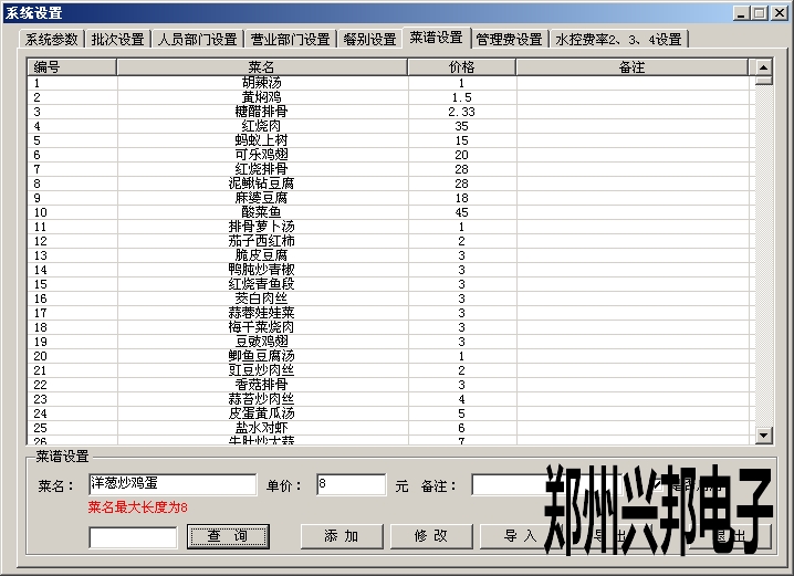 添加菜单时,输入菜名、单价、备注(可填可不填)、选择是否启用,然后点击添加即可。添加后可修改、导入、导出菜名、单价等信息,最多可添加2000个菜单,菜单添加后不能删除,可以选择是否启用。菜名最大为8个汉字,可以为汉字、数字、字母或者特殊字符。