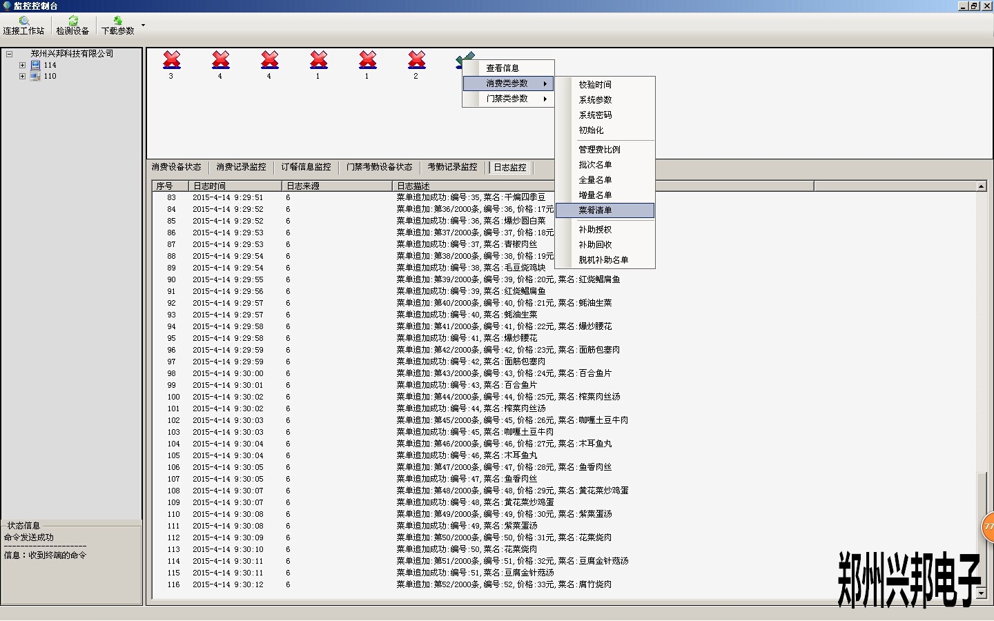 2.菜单添加完成后,需要将菜单通过下载参数的方法下载到消费机中,下载时需要将机器和软件连通,下载方法如下图所示: