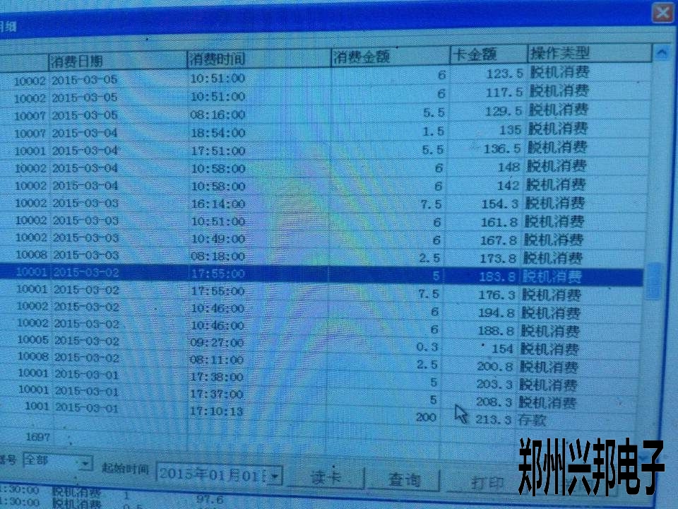 让客户在软件里面查看一下个人明细表,选择这张卡从开卡到现在的时间段,从下往上看,因采集的时候只显示到分,没有显示到秒,所以看数据的时候要在同一日期的往上看一下,有的是没有按顺序排列的。像图上所示的,所选择的这一列应该是比下面的这一列先消费的。还有一条是10005号的对不上,5号机应该是时间错误了,这条应该是3月3 号的消费数据。把5号机校一下时,下载一下参数就可以了。这种问题就解决了。