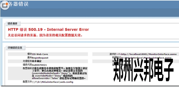 校园一卡通软件在WIN7操作系统安装后,创建IIS浏览的时候出现了“HTTP 错误 500.19 - Internal Server Error ”错误,如下图: