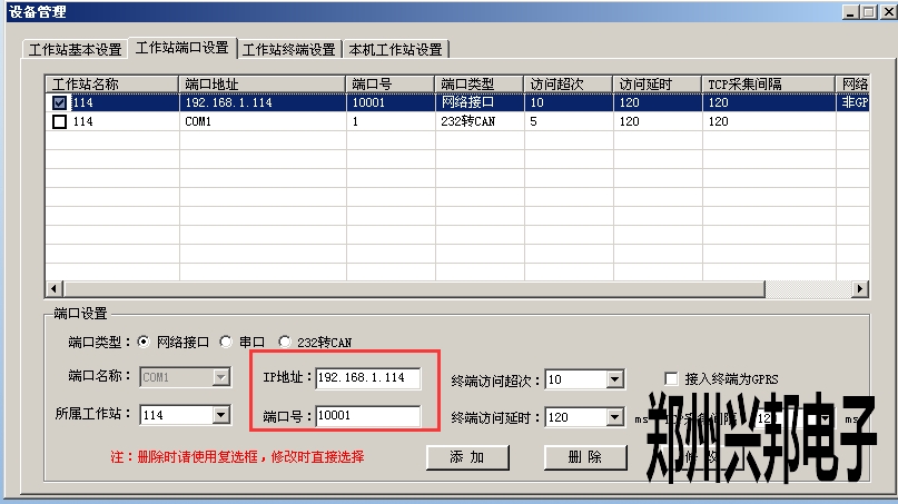 软件中在工作站端口设置中,端口类型要选择‘网络接口’,IP地址一栏要输入本机电脑的IP地址(不是消费机的IP地址),端口号一栏要输入配置模块IP时设置的远程端口号,如下图所示,然后点击添加即可