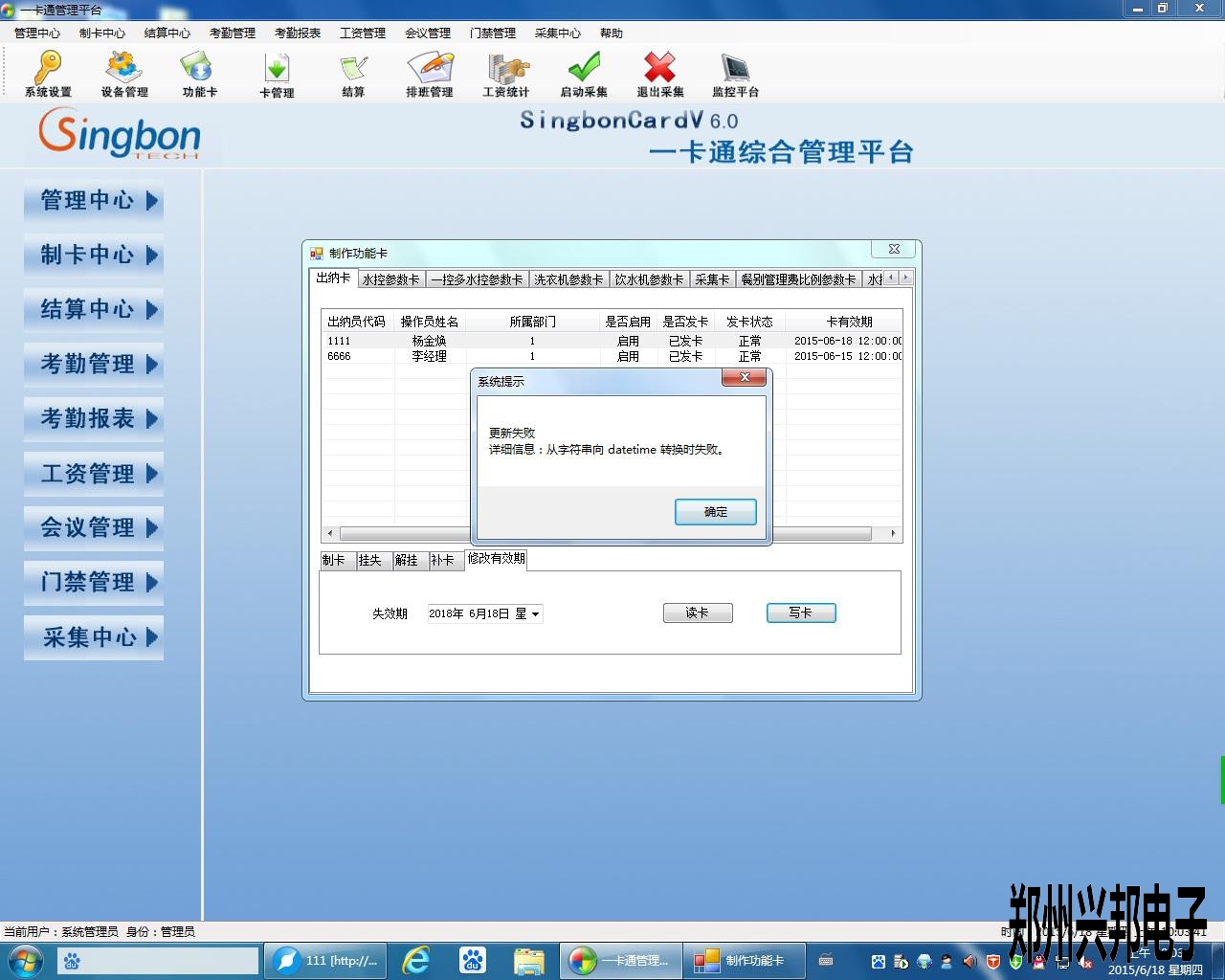 有客户反应,在使用食堂消费机软件时登录出纳卡的时候提示己过有效期,进入软件修改有效期的时间出现了报错,出现了更新失败,从字符串向datetime转换失败。这是什么情况造成的呢?
