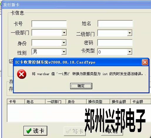 客户使用的是我们的局域网一卡通食堂售饭机,在使用我们软件时,新卡无法发行,在发行新卡的时候出现了将varchar值‘一1男2’转换为数据类型为int的列时发生语法错误。