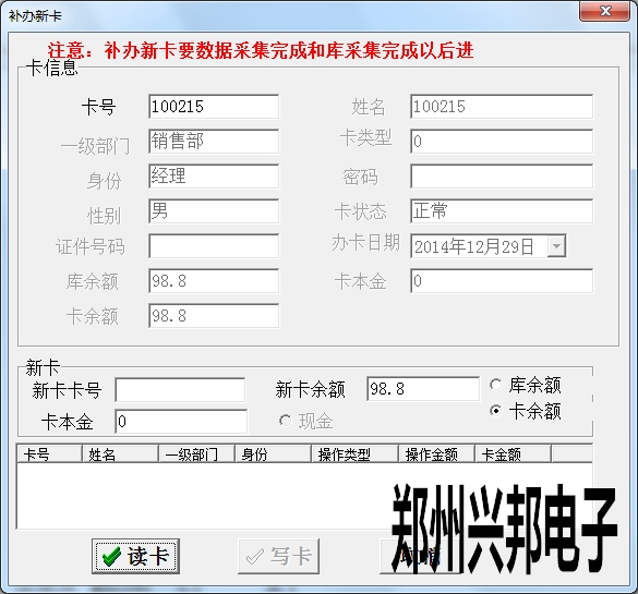 校园一卡通软件补办新卡是针对原卡丢失或者损坏,换一张新的卡片。新卡中的信息与原卡相同,在进行操作时输入原卡卡号,按回车键,出现原卡基本信息,然后将新卡放在读卡器上,点击读卡再写卡,即完成补办新卡的操作。新卡可在机器上使用,而旧卡在软件中会显示此卡未发行,在机器上会出现4-err的提示。即使重新发行,在机器上操作还是显示挂失卡,必须进行解挂后才能使用。需要注意的是补办新卡必须要在数据采集和库采集完成后再进行操作。