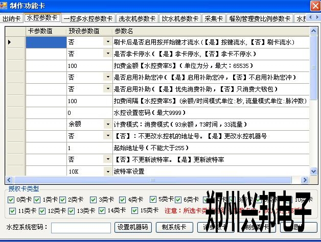 互联网 一卡通浴室水控机,具有多费率扣费功能,不同卡类型的卡片可以按不同的费率扣费,甚至免费使用,费率最多可以设置5个费率,分别是费率1(最低消费周期,分卡类型)、费率2(时间段费率,分卡类型)、费率3(时间段费率,分卡类型)、费率4(时间段费率,分卡类型)、费率5(不分卡类型)。下面介绍一下在软件中如何设置: