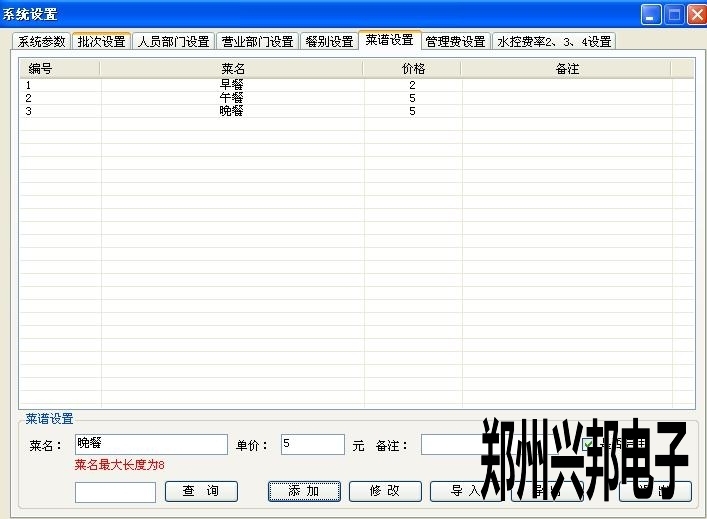 1、在软件上先添加一下早中晚餐的金额。在系统设置里面的菜谱设置里设置是。