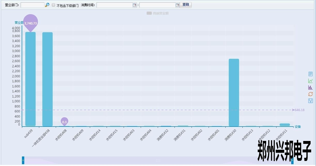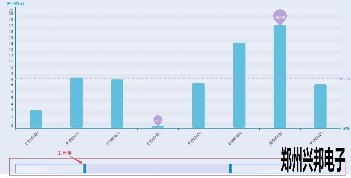 这是一个柱状的数据图表,展示了各个终端在所查询时间内的营业情况,那么最下面的那条横杠是什么呢?其实那是一个工具条,用来集中显示某个具体的柱状数据,如水控机409以及后面的几个数据都看不大清楚,想要拉近一点看看,怎么做呢,很简单,只要拉动最下面的工具条就好了,就像这样: