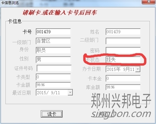 卡片就上面三种状态,另外一些操作,会造成卡状态改变,比如:挂失的卡解挂,就变成消费卡;挂失的卡补办新卡,挂失卡就会变成新卡;消费卡被收缴旧卡就变成新卡。新卡在消费机上刷卡会显示1-Err,消费卡会显示金额,挂失卡会显示4-Err