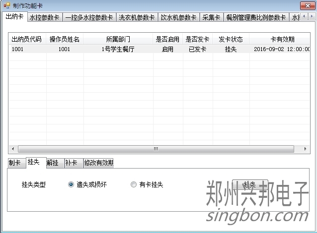 客户使用的我们的互联网一卡通食堂售饭机软件,不小心把出纳卡制成员工卡使用了,遇到这种情况,(1)用超级管理员身份登录软件,在软件的制卡中心-功能卡制作-出纳卡页面里选中之前的出纳员信息,选择挂失(挂失类型选择遗失或损坏),点击右边的挂失把原来的出纳员账号挂失;
