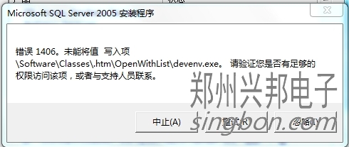 客户使用我们的互联网一卡通食堂售饭机,自己安装SQL2005数据库没装成功,让我们远程再重装一次,在控制面板里卸载后并删除之前的安装文件,又重新安装时提示:错误1406。未能将值 写入项\Software\Classes\.htm\OpenWithList\devenv.exe。请验证您是否有足够的权限访问该项,或者与支持人员联系。这时该怎样解决呢?