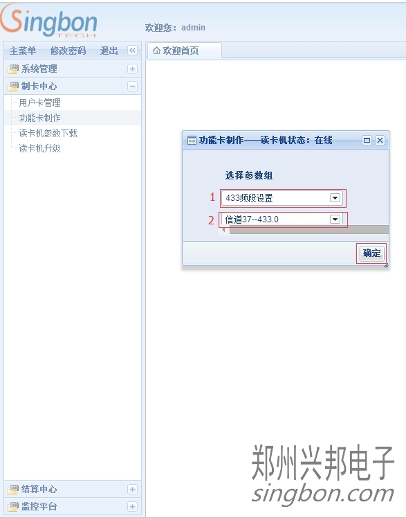 在上图中,方框1处参数组选择“433频段设置”,方框2处是供用户选择的信道,用户选择好需要使用的信道后,在绑定的读卡机上放一张相同参数未发行的卡片,点击“确定”按钮后功能卡制作成功。用制作好的功能卡在机器的刷卡处刷卡,从而修改机器的信道。