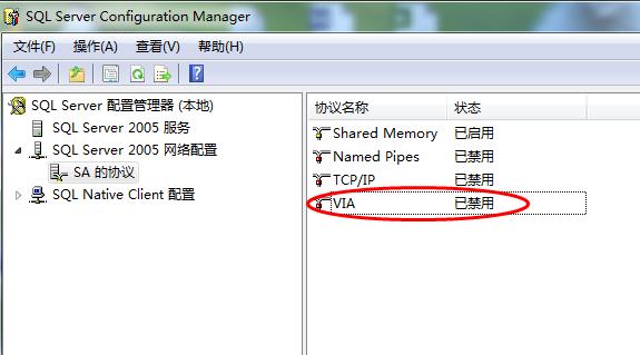 4、打开SQL Server 2005中的配置工具SQL Server Configure Manager,将VIA协议禁用
