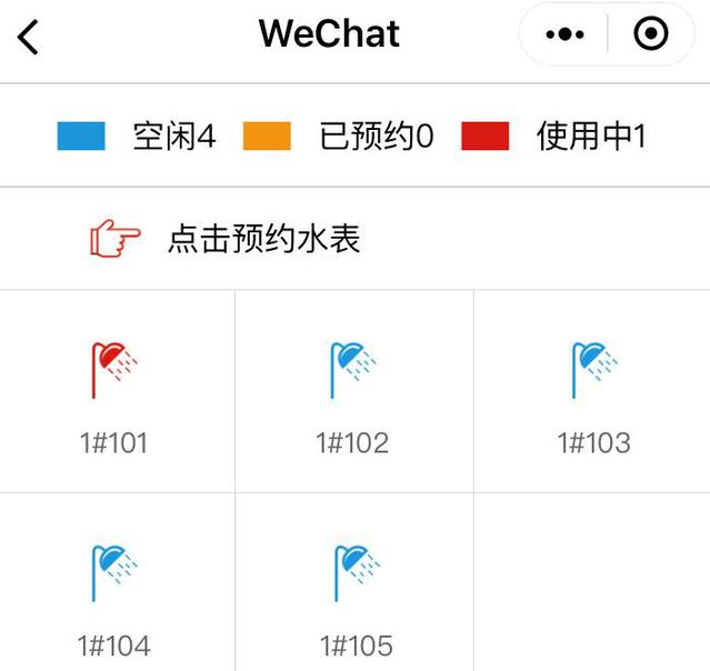 第二步:点击“预约”功能,选择想要使用的水控器进行预约,获取预约码及时间。