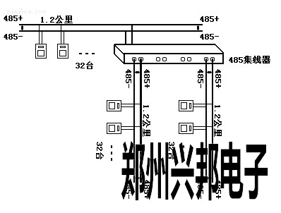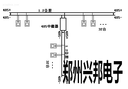 利用485中继器或485集线器,可以将一个大型485网络分隔成若干个网段。485中继器或485集线器就如同485网段之间连接的"桥梁"。当然每个网段还是遵循上面的485规范,即1.2公里长度,32个节点数。