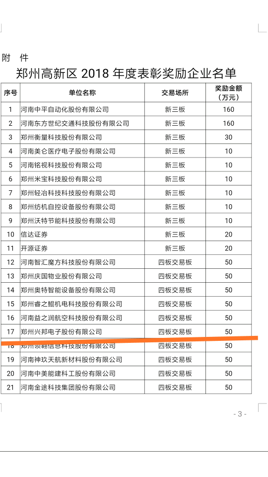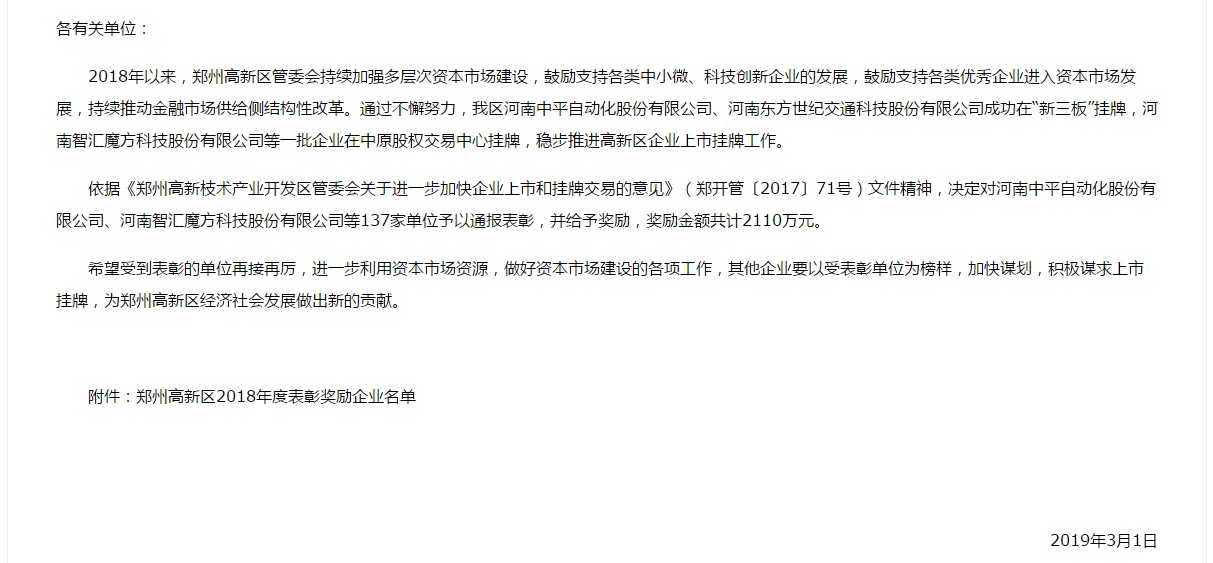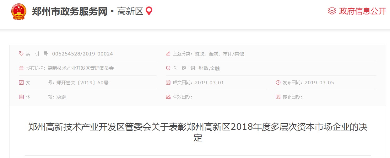 [文章内容简介]:转发:郑州高新技术产业开发区管委会关于表彰郑州高新区2018年度多层次资本市场企业的决定