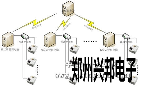 如上图所示,整个系统的管理电脑单独存在,在刚开始建设时就把各个分店的电脑数据库单独建立,制作卡片时,通过卡片的号码段位来区分各店的范围,只是在需要传输数据时,通过花生壳软件等工具绑定IP地址,使各家分店和总部服务器之间的通讯无地理的局限,实现整个系统数据的实时交换。
