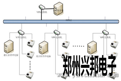 如上图所示,把整个系统的管理电脑纳入到VPN局域网络中来,使各家分店和总部服务器之间的通讯无地理的局限,实现整个系统数据的实时交换。
